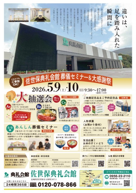 佐世保典礼会館(長崎県佐世保市大和町387-3 TEL0956-37-8407) にて『葬儀セミナー&大感謝祭』を開催いたします。
