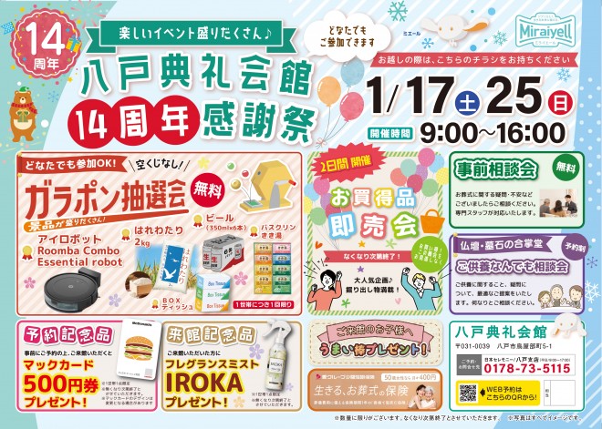 2026.01.17 (土)~2026.01.25 (日) 1/17(土)・25(日)9:00~16:00 八戸典礼会館(八戸市鳥屋部町5-1 TEL0178-73-5170) にて『14周年感謝祭』を開催いたします。