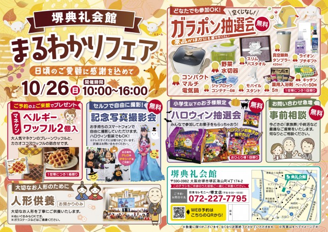 簡単1分お申込み10/26(日)10:00~16:00 堺典礼会館(堺市堺区海山町4丁174-2 TEL072-225-0085) にて