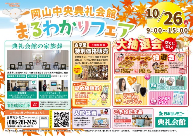 簡単1分お申込み10/26(日)9:00~15:00 岡山中央典礼会館(岡山市北区清輝橋四丁目7-7 TEL086-235-3360) にて