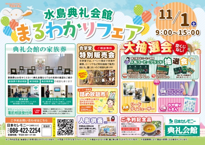 簡単1分お申込み11/1(土)9:00~15:00 水島典礼会館(倉敷市東塚7-2-30 TEL086-450-3771) にて