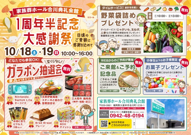 家族葬ホール合川典礼会館(久留米市合川町1239-1 TEL0942-48-0412) にて『1周年半記念大感謝祭』を開催いたします。
