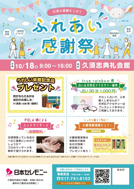 簡単1分お申込み10/18(土)9:00~16:00 久須志典礼会館(青森市久須志2-2-11) にて『ふれあい感謝祭』を開催いたします。