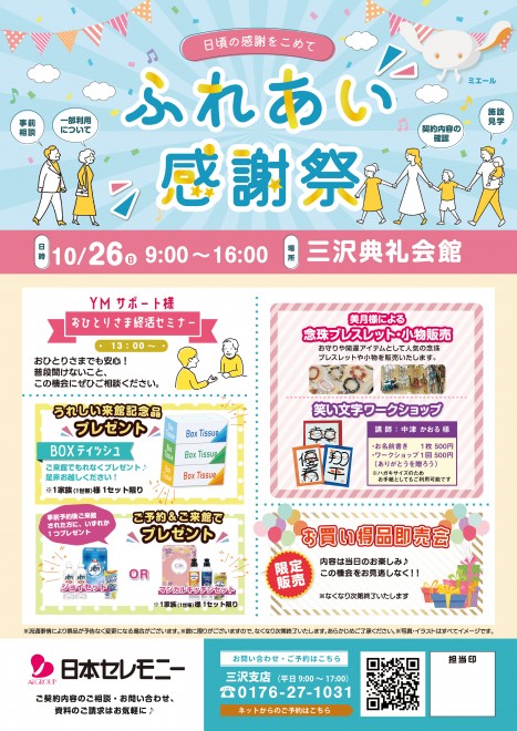 簡単1分お申込み10/26(日)9:00~16:00 三沢典礼会館(三沢市大字三沢字上屋敷163-10) にて『ふれあい感謝祭』を開催いたします。