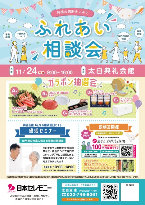 2025.11.24 (月)~2025.11.24 (月) 11/24(月・祝)太白典礼会館(仙台市太白区鹿野二丁目19-20 TEL 022-304-5122) にて『ふれあい相談会』を開催いたします。