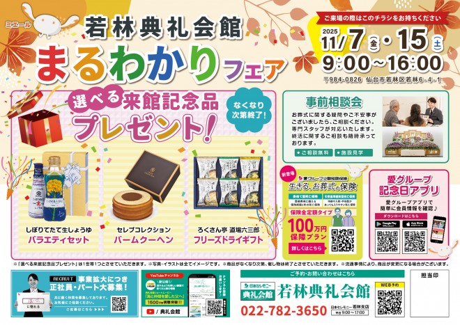 2025.11.07 (金)~2025.11.15 (土)		11/7(金)・15(土) 9:00~16:00 若林典礼会館 (仙台市若林区若林6-4-1 TEL:022-285-4355) にて