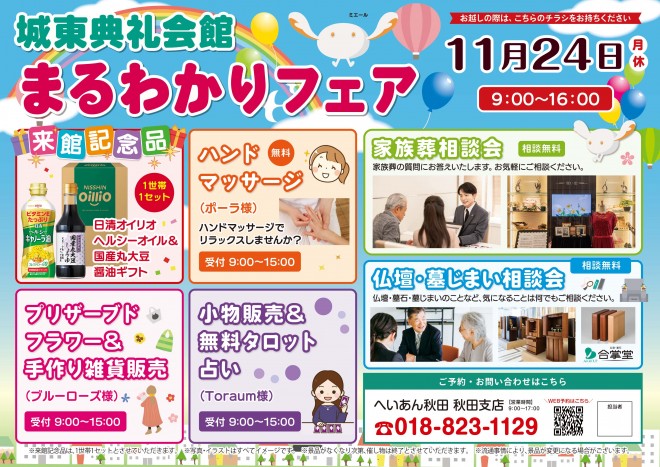 2025.11.24 (月)~2025.11.24 (月)		11/24(月・休)9:00~16:00 城東典礼会館(秋田市広面字蓮沼35-1 TEL:018-889-0990)にて