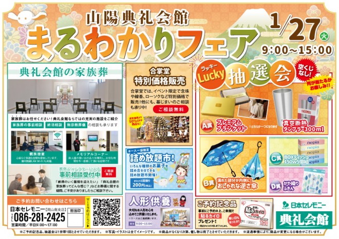 2026.01.27 (火)~2026.01.27 (火) 1/27(火)9:00~15:00 山陽典礼会館(岡山市南区古新田1167-9 TEL086-281-5800) にて