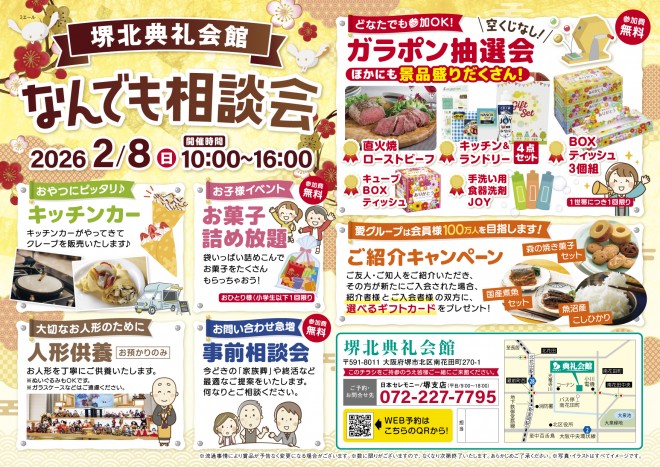 2026.02.08 (日)~2026.02.08 (日) 2/8(日)10:00~16:00 堺北典礼会館(堺市北区南花田町270-1 TEL072-250-4200) にて
