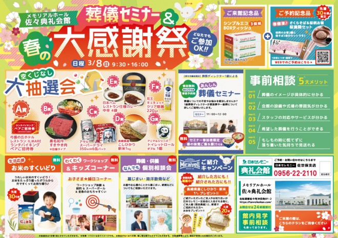 メモリアルホール 佐々典礼会館(北松浦郡佐々町沖田免81-2 TEL:0120-720-725) にて『葬儀セミナー&春の大感謝祭』を開催いたします。