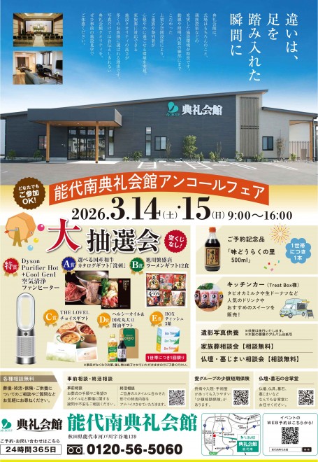 2026.03.14 (土)~2026.03.15 (日) 3/14(土)・15(日)9:00~16:00 能代南典礼会館(能代市河戸川字谷地139 TEL:0185-54-1131)にて