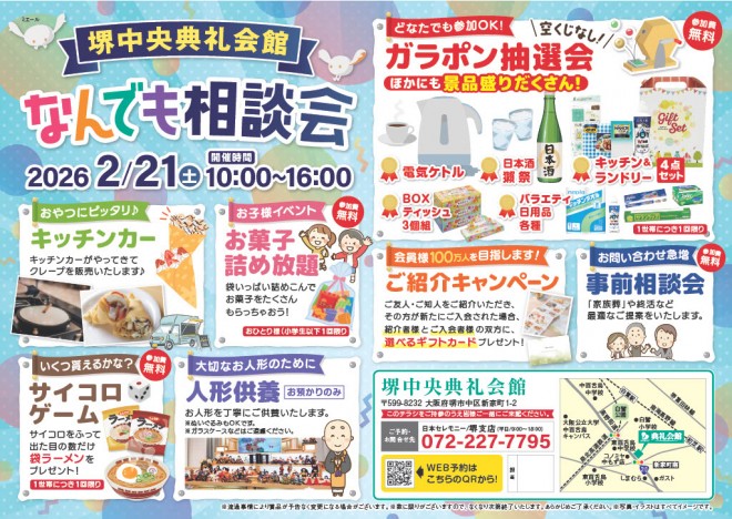 堺中央典礼会館(大阪府堺市中区新家町1-2 TEL:072-230-1233) にて『なんでも相談会』を開催いたします。