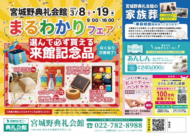 2026.03.08 (日)~2026.03.19 (木) 3/8(日)・3/19(木) 9:00~16:00 宮城野典礼会館 (仙台市宮城野区苦竹2-1-27 TEL:022-782-6630) にて