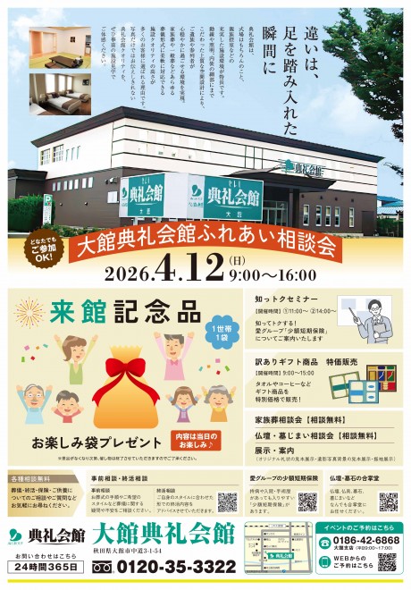 2026.04.12 (日)~2026.04.12 (日) 4/12(日)9:00~16:00 大館典礼会館(大館市中道3-1-54 TEL:0186-44-5520)にて