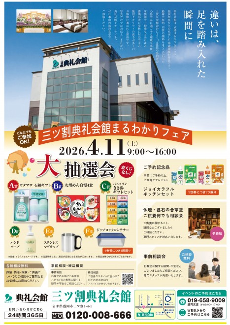 2026.04.11 (土)~2026.04.11 (土) 4/11(土)9:00~16:00 三ツ割典礼会館(盛岡市三ツ割4丁目4-1 TEL019-663-8600) にて『まるわかりフェア』を開催いたします。
