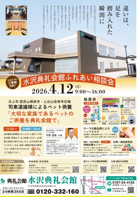 2026.04.12 (日)~2026.04.12 (日) 4/12(日)9:00~16:00 水沢典礼会館(奥州市水沢中田町5-41 TEL0197-22-8900) にて『ふれあい相談会』を開催いたします。