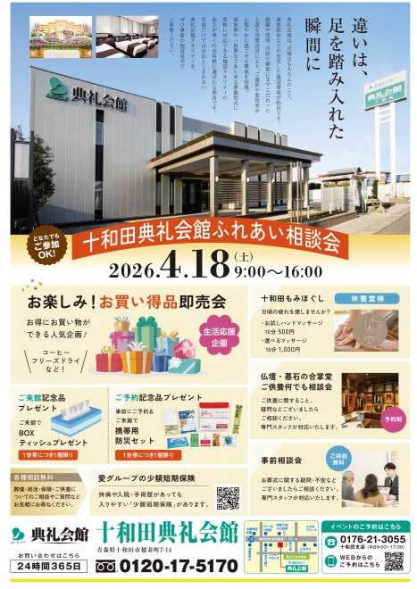 2026.04.18 (土)~2026.04.18 (土) 4/18(土)9:00~16:00 十和田典礼会館(十和田市穂並町7-14 TEL0176-21-5560) にて『ふれあい相談会』を開催いたします。