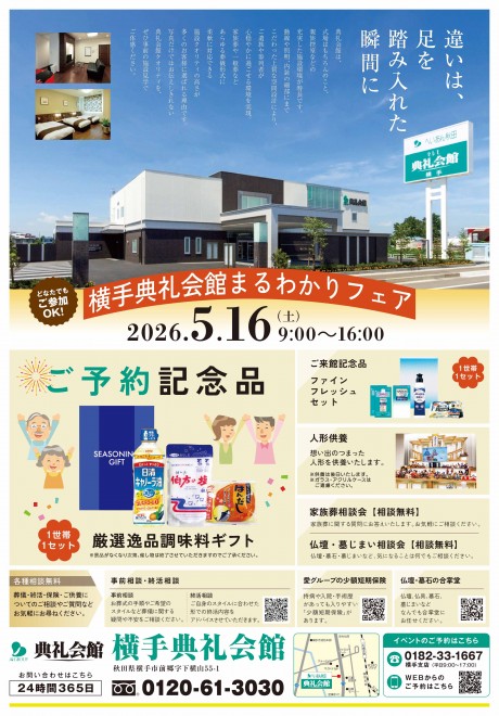 2026.05.16 (土)~2026.05.16 (土) 5/16(土)9:00~16:00 横手典礼会館(横手市前郷字下横山55-1 TEL:0182-35-6277)にて