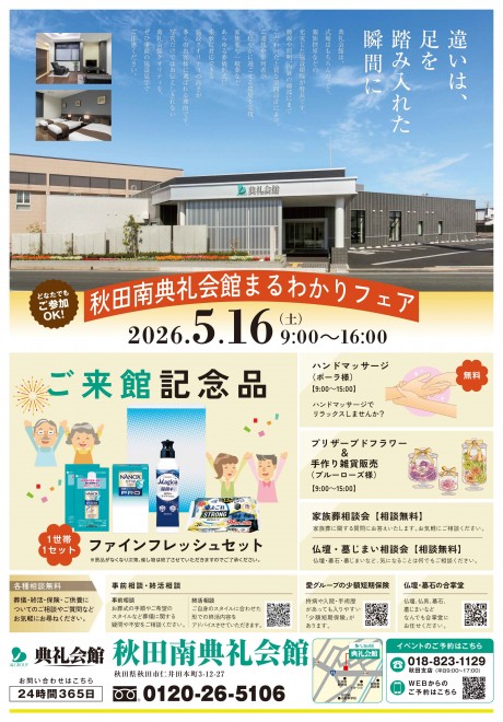 2026.05.16 (土)~2026.05.16 (土) 5/16(土)9:00~16:00 秋田南典礼会館(秋田市仁井田本町3-12-27 TEL:018-892-6890)にて