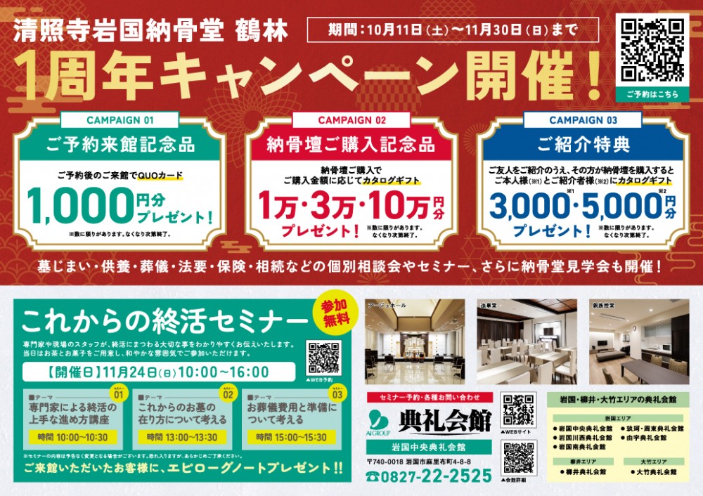※ご来館記念品は数に限りがあります。なくなり次第終了イベント期間外での事前相談もお受けしております。 事前相談・その他お問い合わせにつきましては担当者よりメールまたはお電話にてご連絡させていただきます。 ご予約項目必須 館内見学 鶴林に関するご相談 お葬儀に関するご相談 11/24(日)終活セミナー その他 ※11/24(日)終活セミナーは3回のセミナーに別れております。複数回参加される方は備考欄に記載ください(10時~、13時~、15時~) ご予約希望日必須 --- 10 11 月 --- 1 2 3 4 5 6 7 8 9 10 11 12 13 14 15 16 17 18 19 20 21 22 23 24 25 26 27 28 29 30 31 日 ※キャンペーン期間=10月11日~11月30日まで ご希望時間任意 --- 9:00~ 10:00~ 11:00~ 12:00~ 13:00~ 14:00~ 15:00~ 16:00~ 17:00~ ※時間帯につきましてはご予約状況によってご希望に添えない場合がございます。 お名前必須 ふりがな必須 住所必須 郵便番号 - ※郵便番号を入力すると自動で住所が入力されます 都道府県 市区町村 番地など メールアドレス必須 電話番号必須 お問い合わせ内容任意 個人情報保護必須 個人情報保護方針をご覧頂き、内容に同意いただいた上で 「同意する」にチェックを付け確認画面にお進みください。 同意する 個人情報保護について
